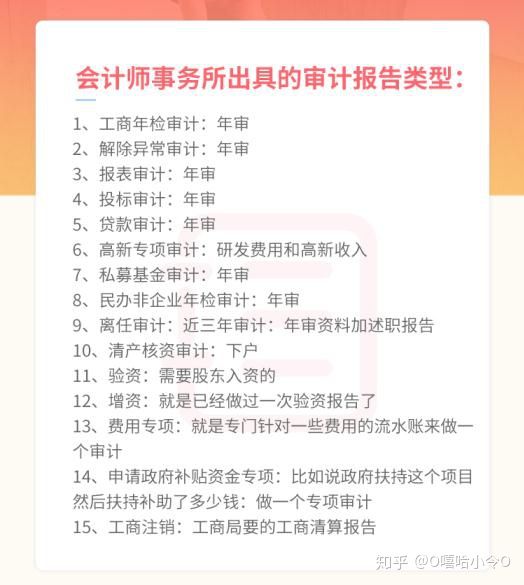一类是会计师事务所出具的审计报告类型:主要包括工商年检审计、解除异常审计、报表审计、投标审计、贷款审计、高新专项审计、私募基金审计、民办非企业年检审计、离任审计、清产核资审计、验资、增资、费用专项、申请政府补贴资金专项、工商注销等。