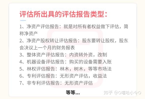 一类是评估所出具的评估报告类型:主要包括净资产评估报告、净资产股权转让评估报告、整体资产评估报告、机器设备评估报告、林权评估报告、专利评估报告、非专利评估报告、软件著作权评估报告、实用新型评估报告、建筑物评估报告、在建工程评估报、个人房产评估报告、公司房产评估报告、土地评估报告等。
