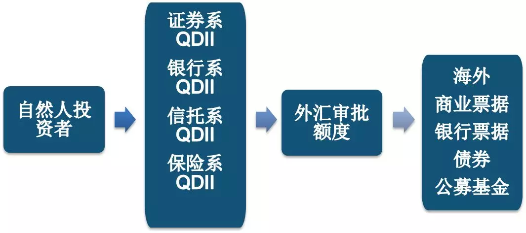 因此,目前个人投资者在QDII路径下,可以向不同的合格境内机构投资者投资不同的境外产品,如下图:
