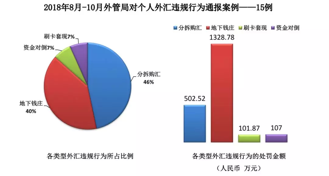 根据外管局2018年8月-10月的外汇违规通报案例,就资金出境有安排的个人而言,外汇违规行为主要有:分拆购汇、资金对倒、通过“地下钱庄”非法买卖外汇、刷卡套现买卖外汇等,以上个人外汇违规行为严重的会引起刑事处罚。下图为外管局对个人外汇违规行为的处罚情况: