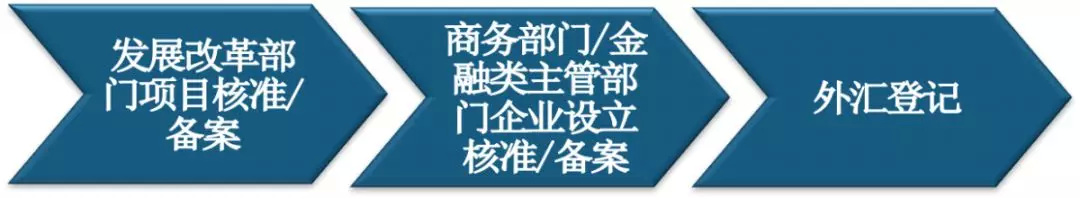 根据相关规定,境内企业进行境外直接投资,需获得发展改革部门(包括国家发改委和省级发改委)对境外投资项目的审批、商务部门(包括商务部及省级商务主管部门)或金融类企业主管部门对企业设立及具体事项审批,最后凭相关审批文件在银行办理外汇登记,如下图: