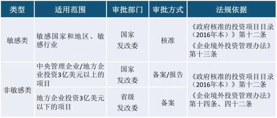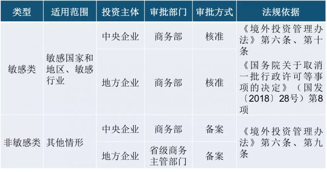 根据商务部发布的《境外投资管理办法》,商务部、人民银行等发布的《对外投资备案(核准)报告暂行办法》,商务部对境内企业通过各种方式(如新设、并购)在境外设立非金融企业的,根据境外投资的不同情形——敏感类和非敏感类,分别实行核准和备案管理。