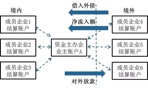 跨境双向人民币资金池的结构大致如下,跨国公司通过开设境内外资金主办企业专门账户进行资金归集,再统一进行境内外资金的划拨,如下图: