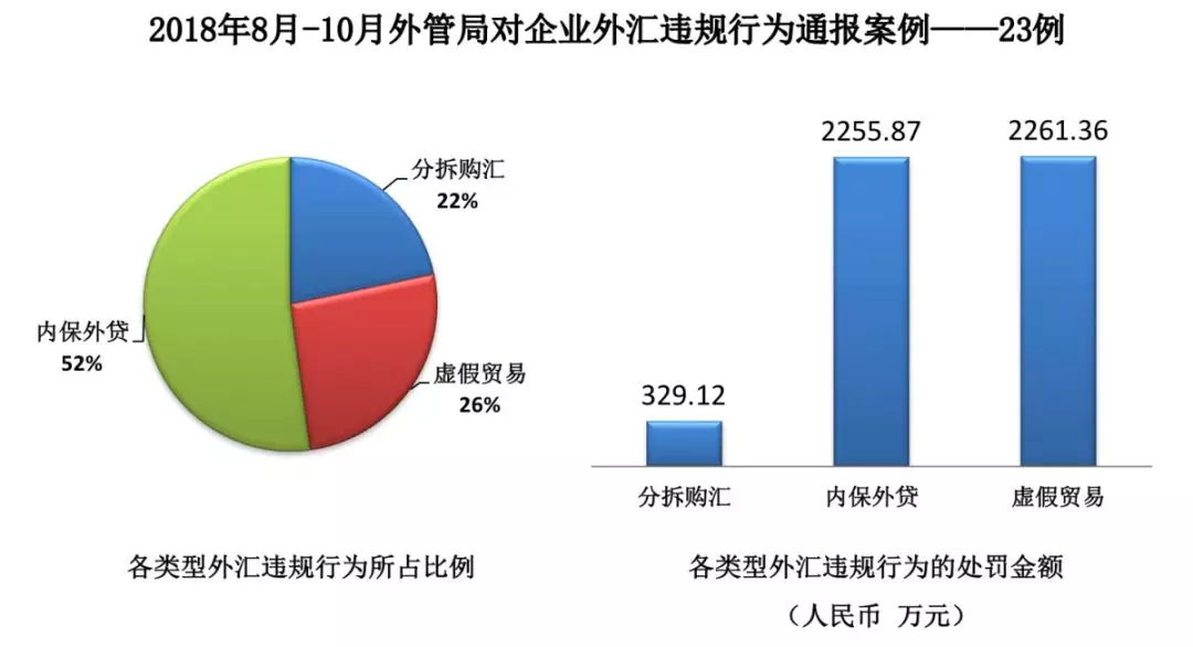 根据外管局2018年8月-10月的外汇违规案例的通报,企业及银行在内的违规案例共23例,因违规行为共处罚金4,846.35万元,其中企业被处罚金1,516.82万元,银行被处罚金3,329.53万元。