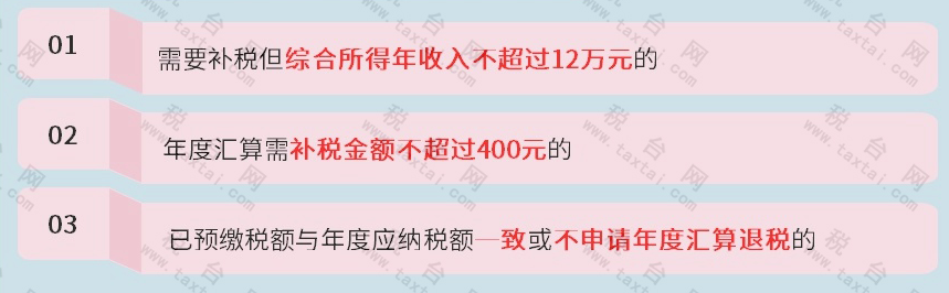 补税是纳税人的义务,若纳税人年度预缴税额低于应纳税额的,且不符合国务院规定豁免汇算义务情形的,均应当办理年度汇算补税。常见情形有: